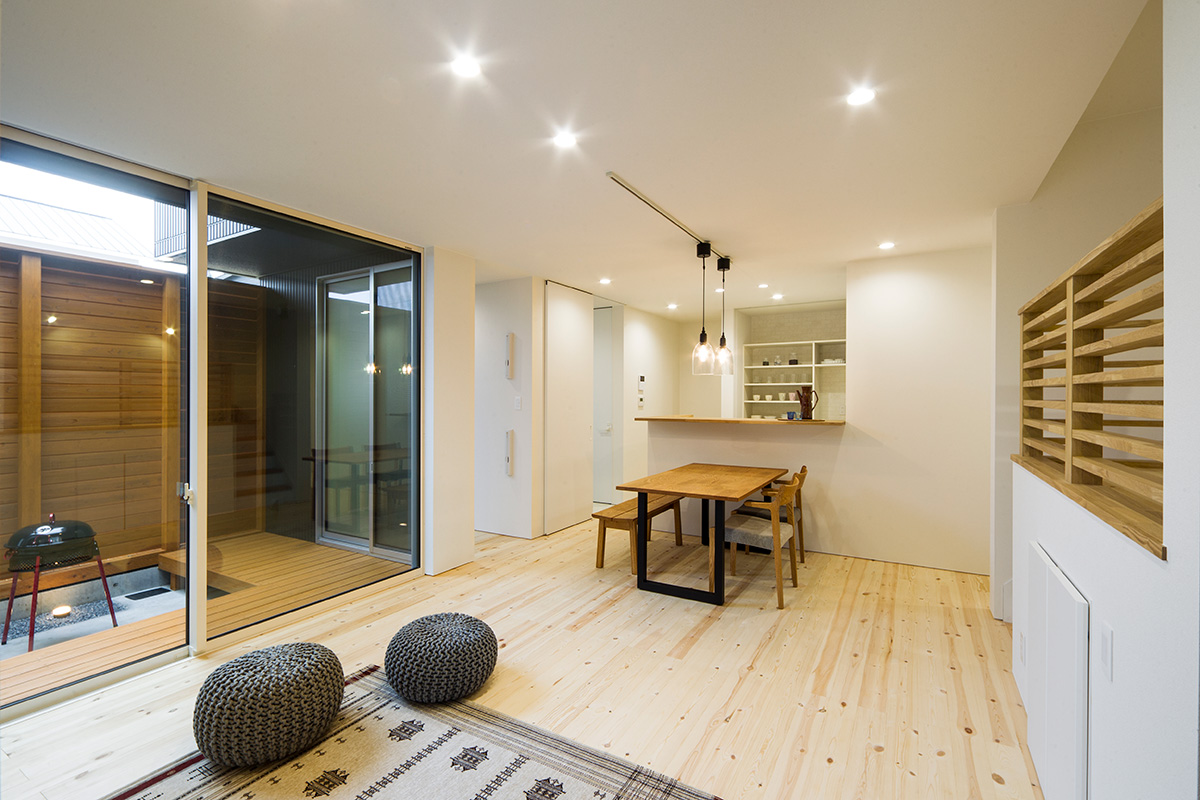 中庭があるということは採光を確保する窓が自然と隣家から離れるということでもあるため、日当たりを確保するためのスペースがそもそも必要なくなるし、家の中に庭があれば、人目を気にすることなくそこでなんでも出来るようになるため、外に庭をつくる必要がなくなるからです。
